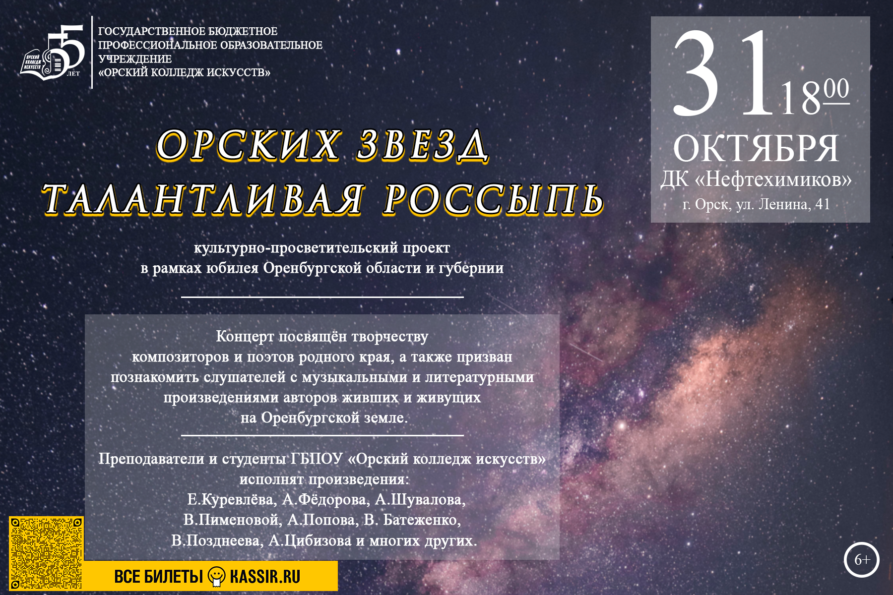 «Орских звёзд талантливая роспись» – культурно-просветительский проект проводится в рамках юбилея Оренбургской области и губернии. Он посвящён творчеству композиторов и поэтов родного края. Проект призван познакомить слушателей с музыкальными и литературными
